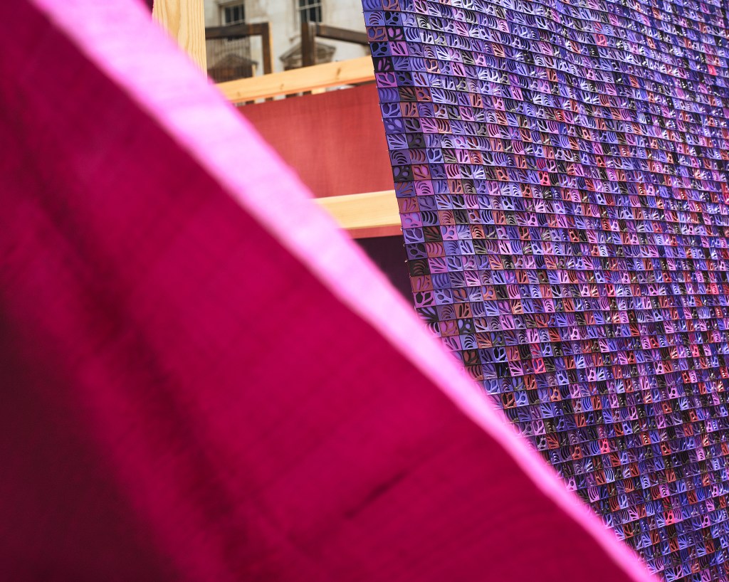 As a reaction to the crushing action required as part of the dye-making tradition, the molecular structure of the shells was used as the inspiration for the construction of this art piece. 4,780 individually 3D printed cells were woven together to produce a recyclable fabric. Since Tyrian Purple cannot be defined as a single shade of colour but rather a range of shades produced from the different predatory sea shells forming part of the Murex family, different shades of purple were used to represent the variety of colours produced through the old recipes.